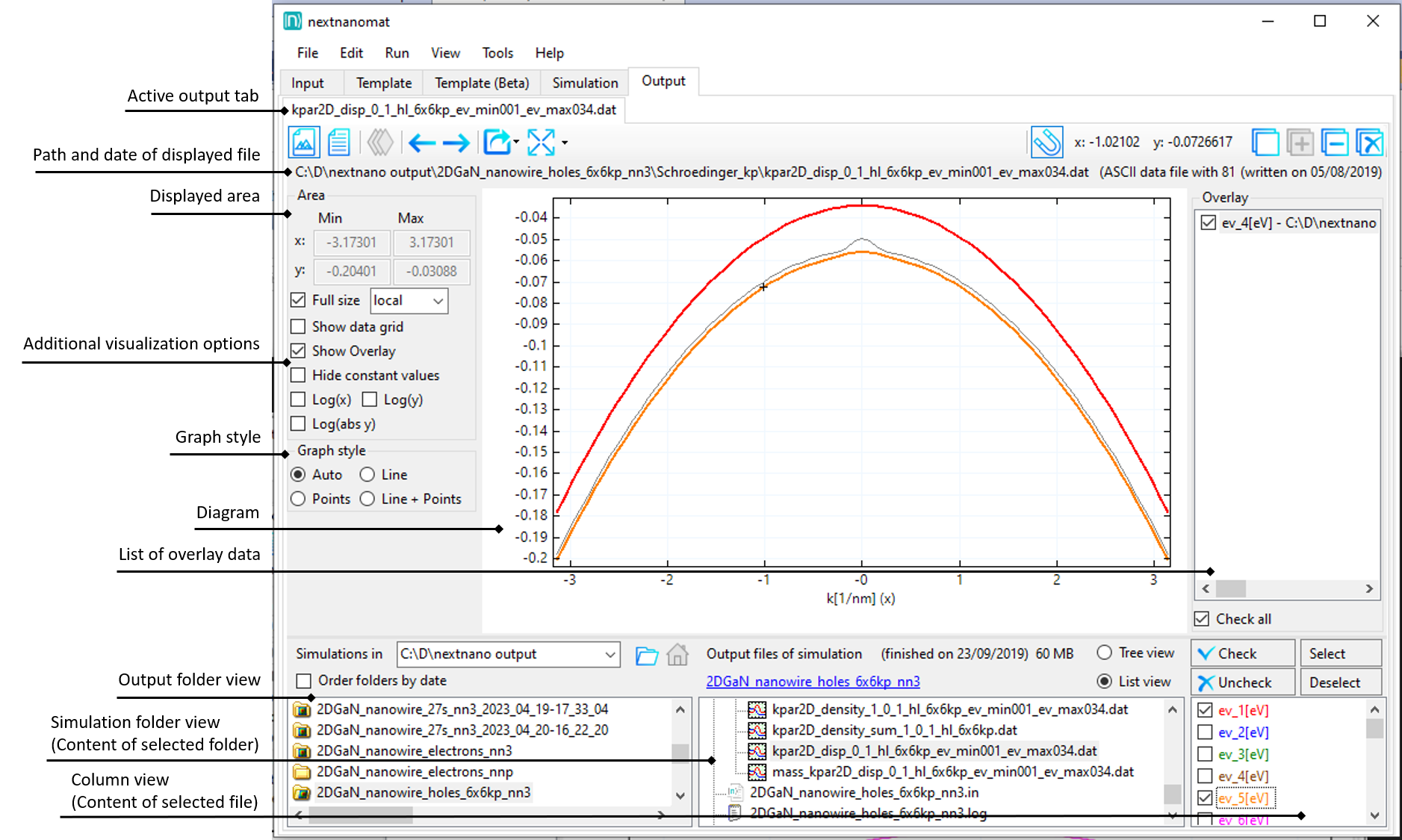 This feature hides any parts of the curves where the value does not change within 5 grid points (two to the left and right). Its purpose is for visualizing wave functions and probability densities on top of band edges. The constant part which represents the energy level will be hidden. This allows to focus on the changing parts as well as for the underlying band edge to be seen. The influence of this feature can be seen in Figure 1.1.23 and Figure 1.1.24.
