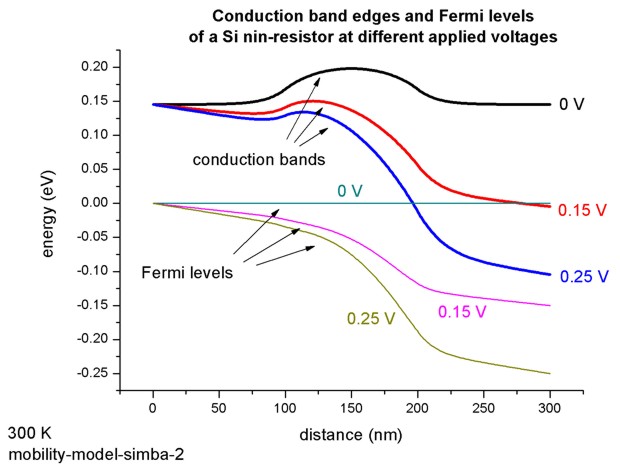 These local quasi-Fermi levels are determined by global current conservation div j = 0, where the current is assumed to be given by the semi-classical relation j = µ(x) n(x) grad EF(x) where µ(x) is the electron mobility which is determined in our example from mobility-model-simba-2.