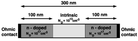 We consider a one-dimensional 300 nm Si-based n-i-n resistor at room temperature, where "n-i-n" stands for "n-doped / intrinsic / n-doped". The intrinsic region and the n-doped regions are each 100 nm wide.