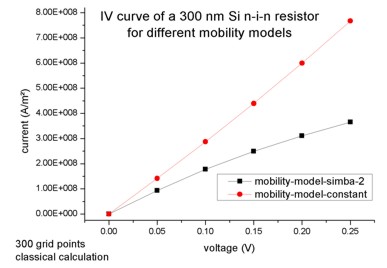 IV characteristics of the 300 nm Si n-i-n resistor for two different mobility models (classical simulations).