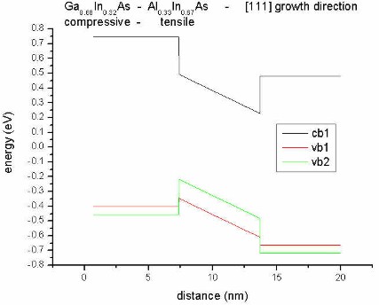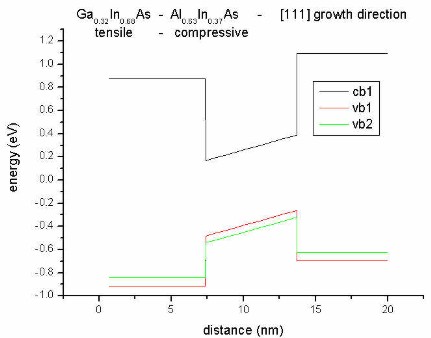 [111] growth direction: The well region is lattice matched to InP, therefore strain is zero. Only the barrier region is subject to strain.