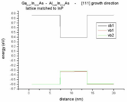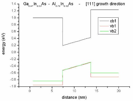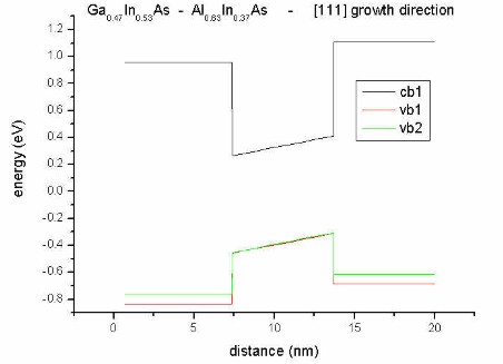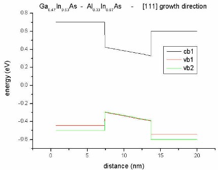 Again we take the [111] direction but this time we take lattice matched Ga0.47In0.53As and Al0.48In0.52As (lattice matched to InP) herby avoiding any strain. Thus we do not get any heavy hole/light hole splitting. Without strain we even don't get piezoelectric charges and thus no slope.