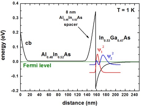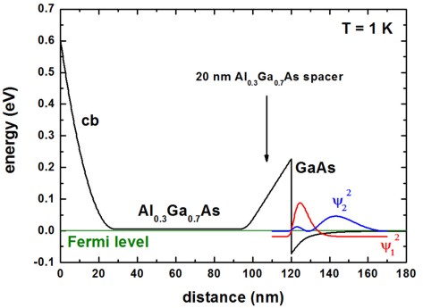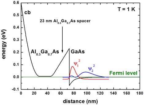 The following figure shows the conduction band edge, the Fermi level and the square of the lowest two electron wave functions at T = 1 K.