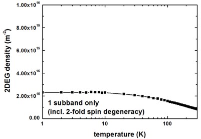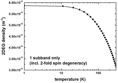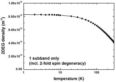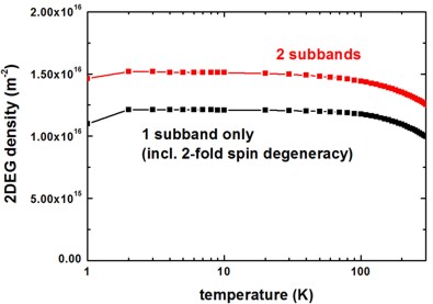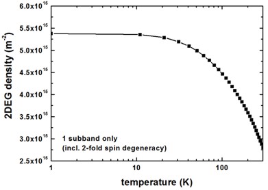 The following figure shows the subband density of the first subband and of the first two subbands as a function of temperature.
