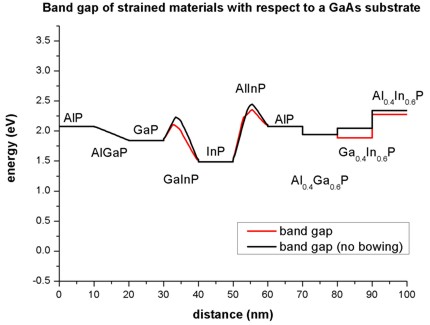 The following figure compares the overall band gap to the case where band gap bowing has been neglected.