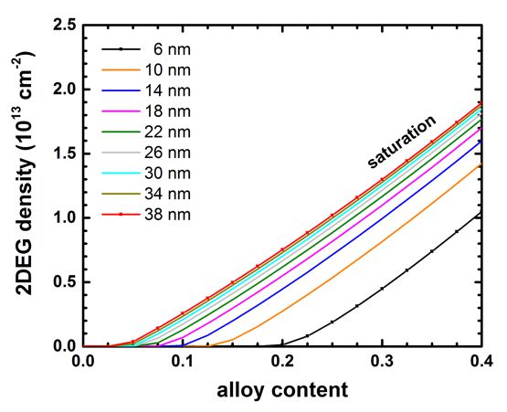 The following figure shows the 2DEG density vs. GaN cap layer thickness for a 30 nm Al0.3Ga0.7N