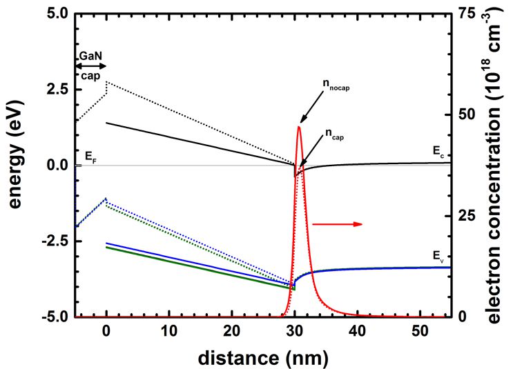 When introducing a GaN cap layer, the density of the 2DEG is reduced.