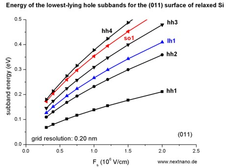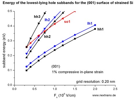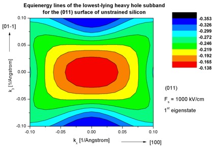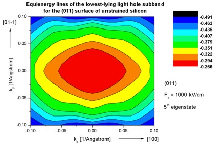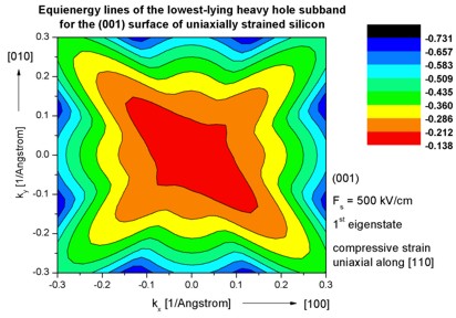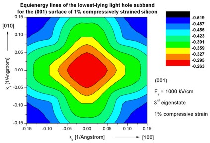 silicon calculated using a strain dependent 6-band k.p Hamitonian. Only one spin