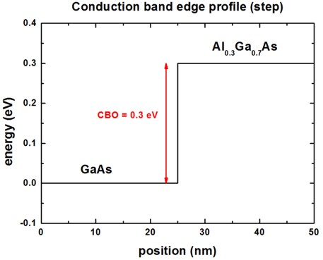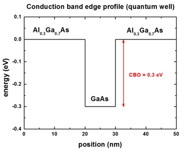 The conduction band offset is assumed to be 0.3 eV, the effective mass is