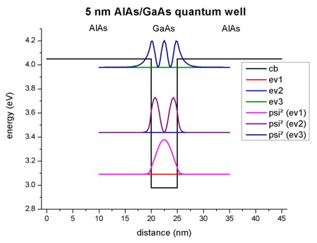 Psi²) for a 5 nm AlAs/GaAs quantum well.