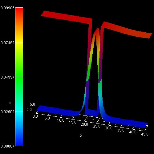 In 2D, the simulated structure is 45 nm long and 5 nm wide (y axis). Along the y